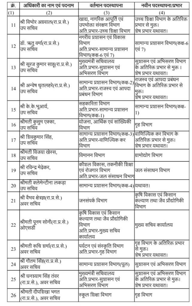 रायपुर अटल नगर, छत्तीसगढ़ शासन के सामान्य प्रशासन विभाग ने राज्य प्रशासनिक सेवा एवं सचिवालय सेवा के अधिकारियों के तत्काल प्रभाव से, आगामी आदेश तक नवीन विभागों में पदस्थापना के आदेश जारी किए हैं, सभी संबंधित अधिकारियों को निर्देश दिया गया है कि वे विभाग के निर्देशानुसार नवीन पदस्थापना में कार्यभार ग्रहण कर पालन प्रतिवेदन तत्काल सामान्य प्रशासन विभाग को उपलब्ध कराना सुनिश्चित करें