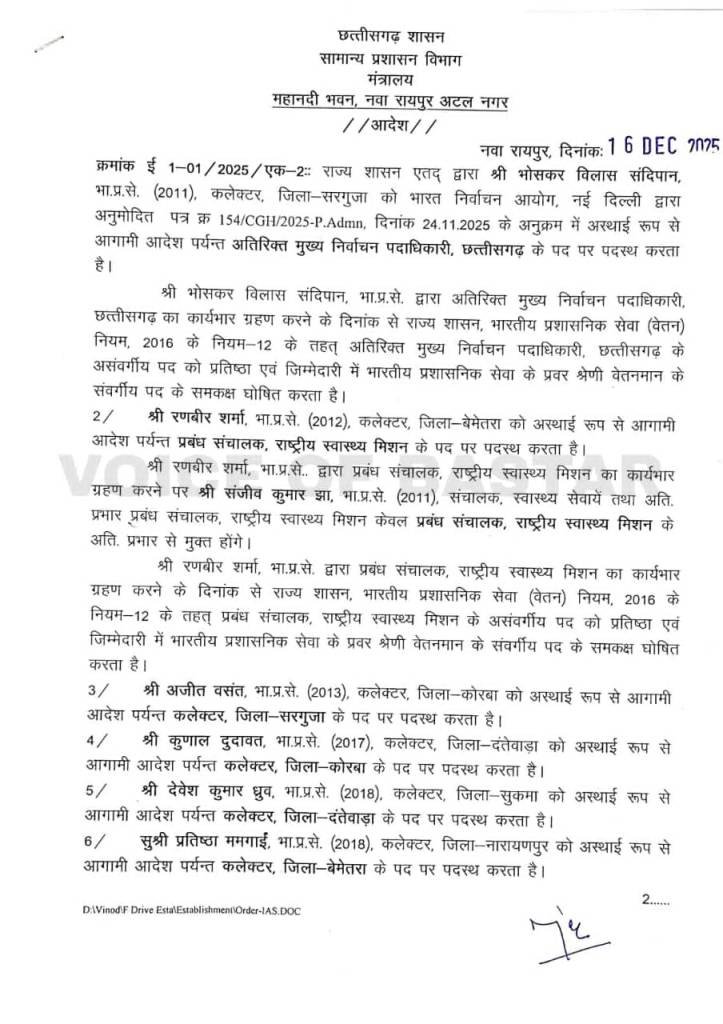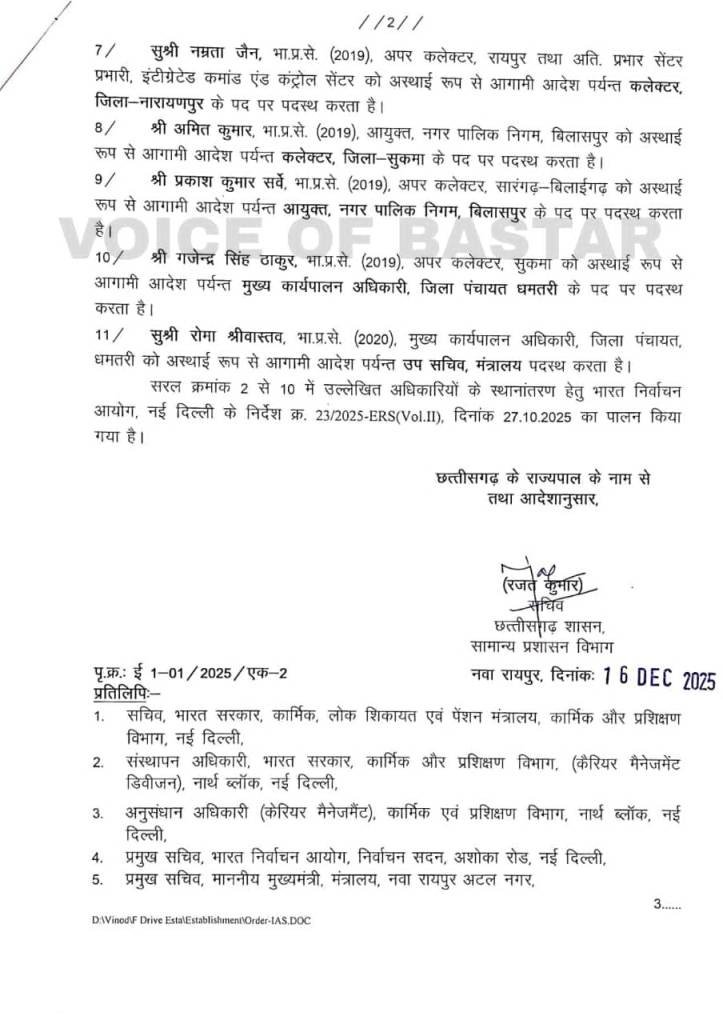 रायपुर। छत्तीसगढ़ शासन ने प्रशासनिक स्तर पर फेरबदल करते हुए भारतीय प्रशासनिक सेवा के 11 अधिकारियों के तबादले के आदेश जारी किए हैं। इस आदेश के तहत सरगुजा, कोरबा, दंतेवाड़ा, सुकमा, बेमेतरा और नारायणपुर जैसे महत्वपूर्ण जिलों के कलेक्टर बदले गए हैं। आदेश विधानसभा सत्र के दौरान जारी किया गया। जारी सूची के अनुसार दंतेवाड़ा के कलेक्टर कुणाल दुदावत को कोरबा जिले का कलेक्टर नियुक्त किया गया है। वहीं कोरबा के कलेक्टर अजीत वसंत को सरगुजा जिले की जिम्मेदारी सौंपी गई है। सरगुजा के कलेक्टर रहे विलास भोस्कर को भारत निर्वाचन आयोग की सहमति के बाद अतिरिक्त मुख्य निर्वाचन पदाधिकारी, छत्तीसगढ़ के पद पर अस्थायी रूप से पदस्थ किया गया है।सुकमा के कलेक्टर देवेश कुमार ध्रुव को दंतेवाड़ा का नया कलेक्टर बनाया गया है। नारायणपुर की कलेक्टर प्रतिष्ठा ममगाई को बेमेतरा जिले की कमान सौंपी गई है, जबकि बेमेतरा के कलेक्टर रणबीर शर्मा को राष्ट्रीय स्वास्थ्य मिशन का प्रबंध संचालक नियुक्त किया गया है। आदेश के तहत वर्ष 2019 बैच के दो आईएएस अधिकारियों को पहली बार कलेक्टर पद की जिम्मेदारी दी गई है। रायपुर में अपर कलेक्टर के रूप में पदस्थ नम्रता जैन को नारायणपुर जिले का कलेक्टर बनाया गया है। वहीं नगर पालिक निगम बिलासपुर के आयुक्त अमित कुमार को सुकमा जिले का कलेक्टर नियुक्त किया गया है।अन्य प्रशासनिक फेरबदल के तहत प्रकाश कुमार सर्वे को नगर पालिक निगम बिलासपुर का आयुक्त, गजेंद्र सिंह ठाकुर को जिला पंचायत धमतरी का मुख्य कार्यपालन अधिकारी तथा रोमा श्रीवास्तव को मंत्रालय में उप सचिव पद पर पदस्थ किया गया है। राज्य शासन ने स्पष्ट किया है कि निर्वाचन आयोग एवं राष्ट्रीय स्वास्थ्य मिशन जैसे असंवर्गीय पदों पर की गई नियुक्तियों को भारतीय प्रशासनिक सेवा वेतन नियमों के तहत प्रवर श्रेणी के समकक्ष माना जाएगा।