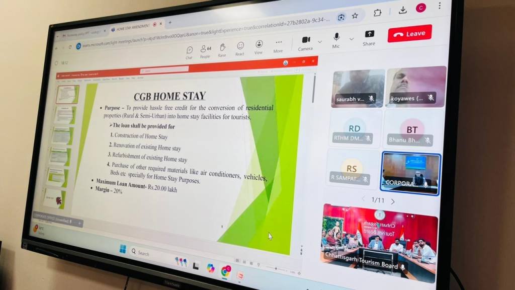 होमस्टे पॉलिसी के प्रभावी क्रियान्वयन, सब्सिडी प्रक्रिया और अतिरिक्त सुविधाओं पर केंद्रित महत्वपूर्ण ऑनलाइन बैठक छत्तीसगढ़ टूरिज्म बोर्ड के प्रबंध संचालक श्री विवेक आचार्य की अध्यक्षता में संपन्न हुई। सरगुजा और बस्तर संभाग के होमस्टे ओनर्स व टूरिज्म स्टेकहोल्डर्स ने ऑनलाइन भाग लिया, जबकि छत्तीसगढ़ ग्रामीण बैंक के अध्यक्ष श्री विनोद अरोड़ा विशेष अतिथि के रूप में उपस्थित रहे।
