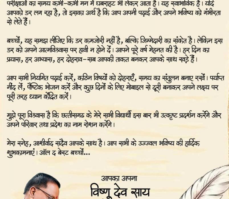 मुख्यमंत्री श्री विष्णु देव साय ने विद्यार्थियों को शुभकामनाएँ देते हुए कहा — “ऑल द बेस्ट, प्यारे बच्चों।”