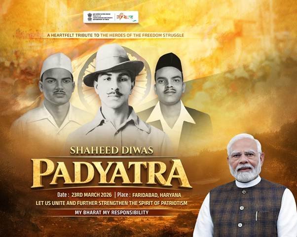 भारत के युवा स्वतंत्रता सेनानियों – शहीद भगत सिंह, शहीद शिवराम राजगुरु और शहीद सुखदेव थापर – के अद्वितीय बलिदान को पवित्र श्रद्धांजलि अर्पित करने हेतु, युवा कार्यक्रम एवं खेल मंत्रालयमेरा युवा भारत (माई भारत) के माध्यम से शहीद दिवस के उपलक्ष्य में 23 मार्च, 2026 को एक राष्ट्रव्यापी पदयात्रा का आयोजन करेगा। यह पहल “मेरा भारत, मेरी जिम्मेदारी” थीम के तहत संचालित की जाएगी।